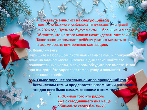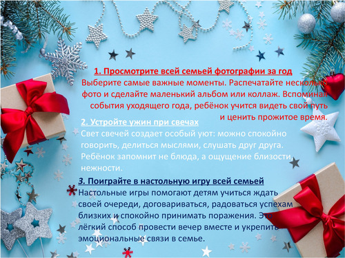 Дорогие друзья, скоро новый год - самый долгожданный, волшебный и конечно же семейный праздник. А ведь ожидание Нового года - это тоже часть большого, доброго, светлого праздника! В карточках Вам будут предложены задания, ... Читать дальше » |