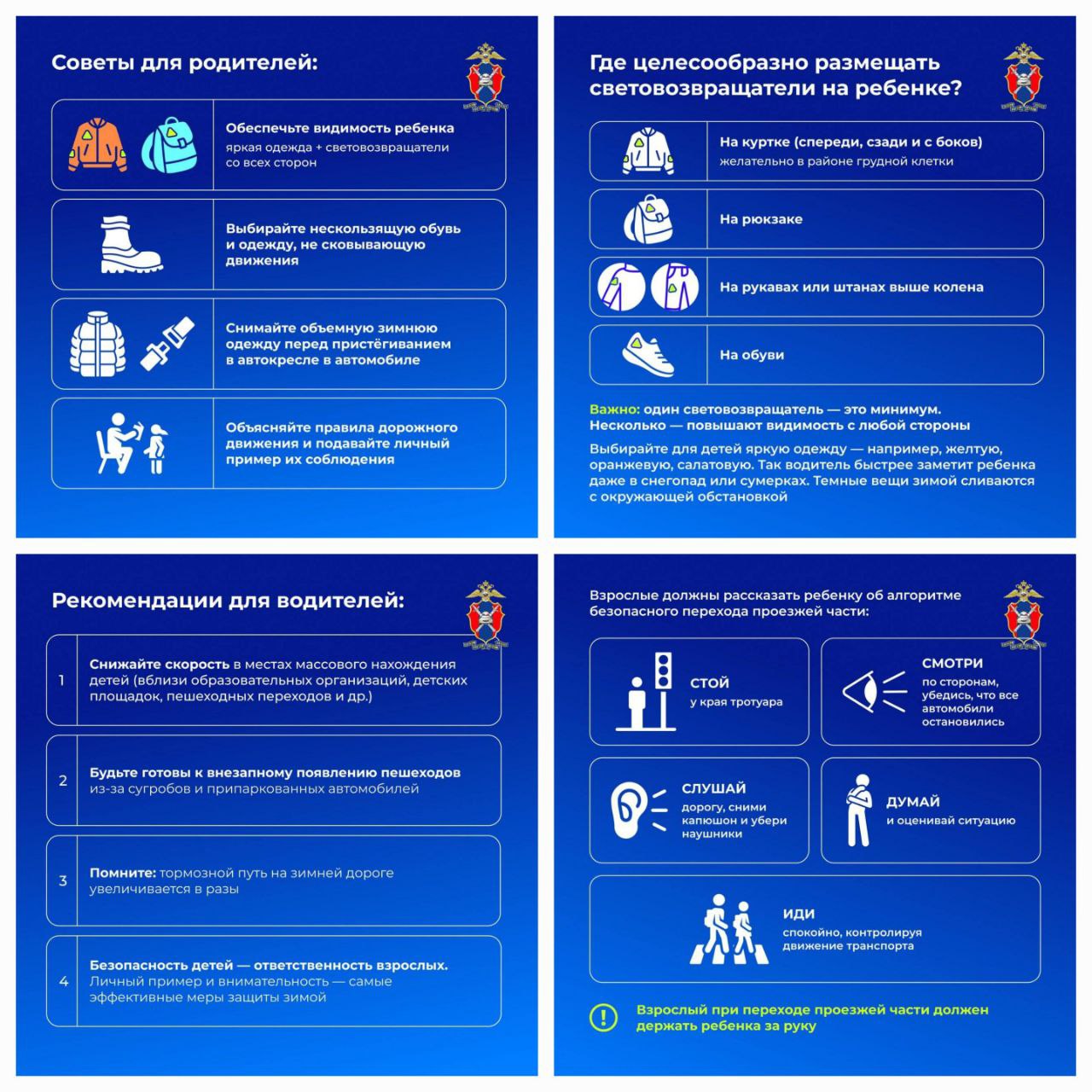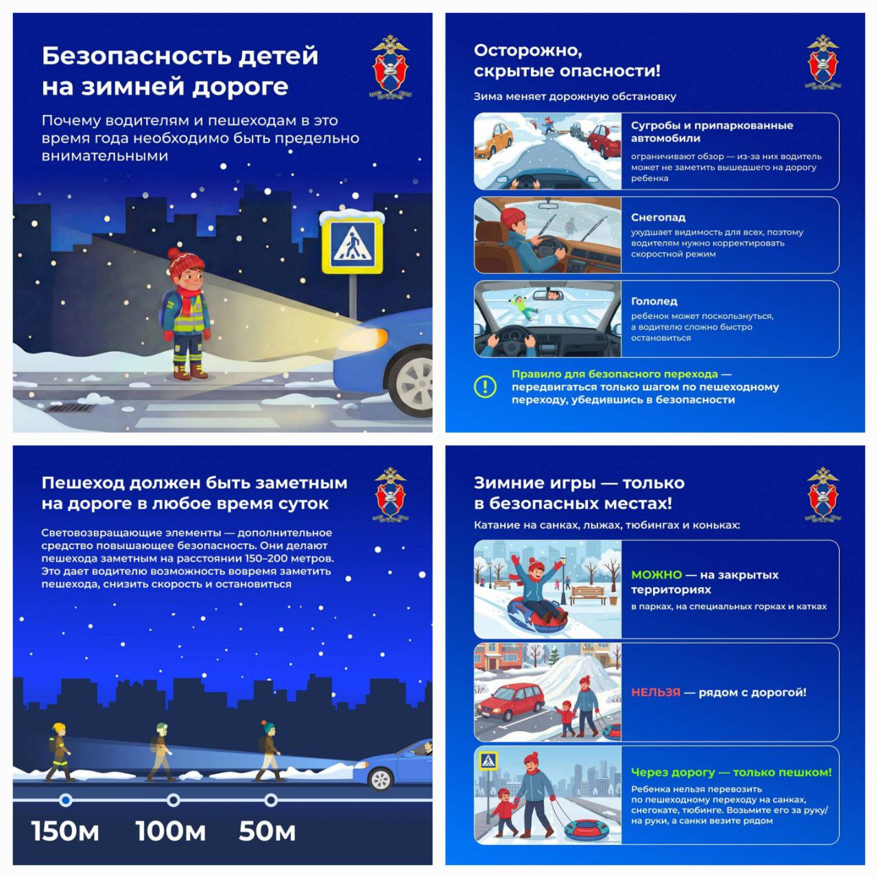 Дети должны играть в зимние игры только в безопасных местах! Нельзя забывать про скрытые опасности: сугробы, снегопад, гололёд! Пешеход должен быть заметным на дороге в любое время суток, носить световозвращающие элементы на одежде, рюкзаке, обуви! Взрослые должны рассказать ребёнку об алгоритме безопасного перехода проезжей части! Подробнее о безопасности на дороге в зимний период в карточках.