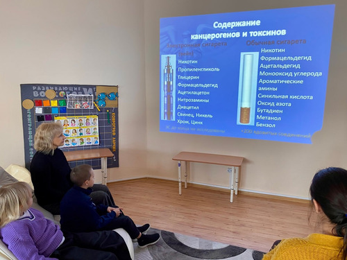Побеседовали с ребятами о вреде курения сигарет, в том числе электронных (вейпов) с никотиносодержащими жидкостями. Школьники посмотрели мультфильм «Тайна едкого дыма» и презентацию на тему «Курение и вейпинг», узнали о том, что производители сигарет получают огромные доходы от продаж вредной продукции, поэтому проводят рекламные компании, поддерживающие миф безопасности вейпа.