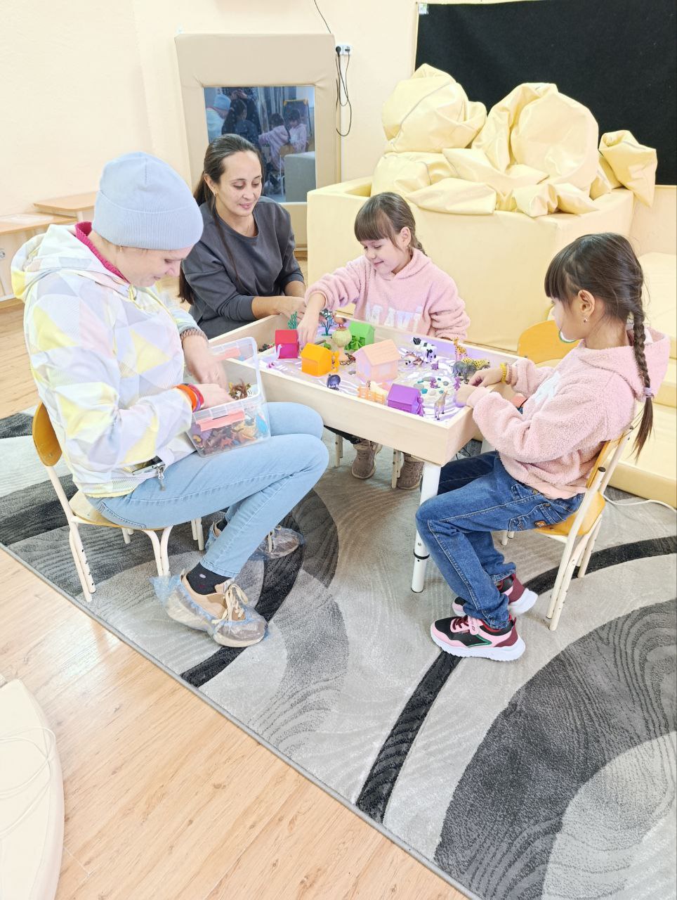В ходе занятия все участники погрузились в увлекательный процесс создания своего мира в световой песочнице. Дети, руководствуясь своей фантазией, использовали различные фигурки и световые эффекты, чтобы выразить свои чувства и идеи. Мама активно поддерживала их, предлагая новые сюжетные линии для игры, что создало атмосферу доверия и сотрудничества.
