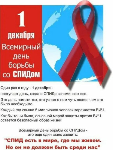 1 декабря - Всемирный день борьбы со СПИДОм, целью которого является повышение осведомлённости об этом коварном неизлечимом заболевании, разрушающем иммунную систему человека.