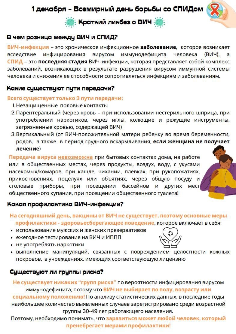 1 декабря - Всемирный день борьбы со СПИДОм, целью которого является повышение осведомлённости об этом коварном неизлечимом заболевании, разрушающем иммунную систему человека. Родителям важно устанавливать доверительные отношения с детьми-подростками, беседовать с ними о способах заражения ВИЧ-инфекцией, мерах профилактики, не считая эту тему запретной.️ Более подробную информацию о синдроме приобретённого иммунодефицита можно прочитать в карточках | |